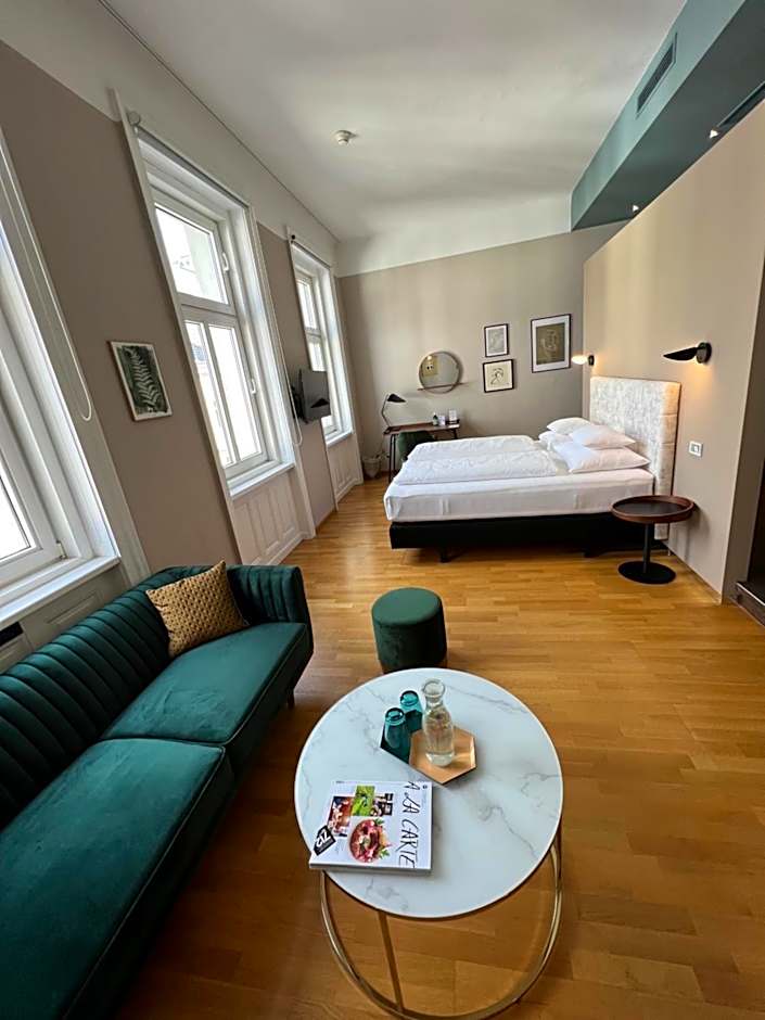 These spacious rooms with approx and with harm of a historic building. 115 ft² offer a wonderful view over Vienna, located on the 4th floor, quiet and light-flooded. They come with air conditioning, and a bathroom with rain shower, designer chair, a Mini-bar with a small bottle of mineral water and a sweet surprise, free of charge , hairdryer, bathrobe and slippers, and grooming products. facing onto the city or one of our two courtyards